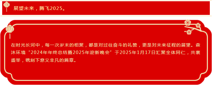 本次年終總結(jié)暨迎新晚會(huì),是森沐環(huán)境對(duì)過(guò)去一年的深情回望,也是對(duì)未來(lái)一年的激昂展望。我們共聚一堂度過(guò)這個(gè)難忘的夜晚,在溫馨與歡樂(lè)中,攜手邁向充滿希望的2025年。