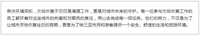 2017年7月創(chuàng)立于海南省三亞市(原名為三亞森沐清潔服務(wù)有限公司,于2020年12月更名為三亞森沐環(huán)境產(chǎn)業(yè)服務(wù)有限公司),是專業(yè)從事環(huán)衛(wèi)保潔和綠化養(yǎng)護(hù)的服務(wù)企業(yè),多年來(lái)我們致力于人居環(huán)境的改善和城市美化的提升,不斷的開拓創(chuàng)新,為城市環(huán)境可持續(xù)發(fā)展貢獻(xiàn)力量。